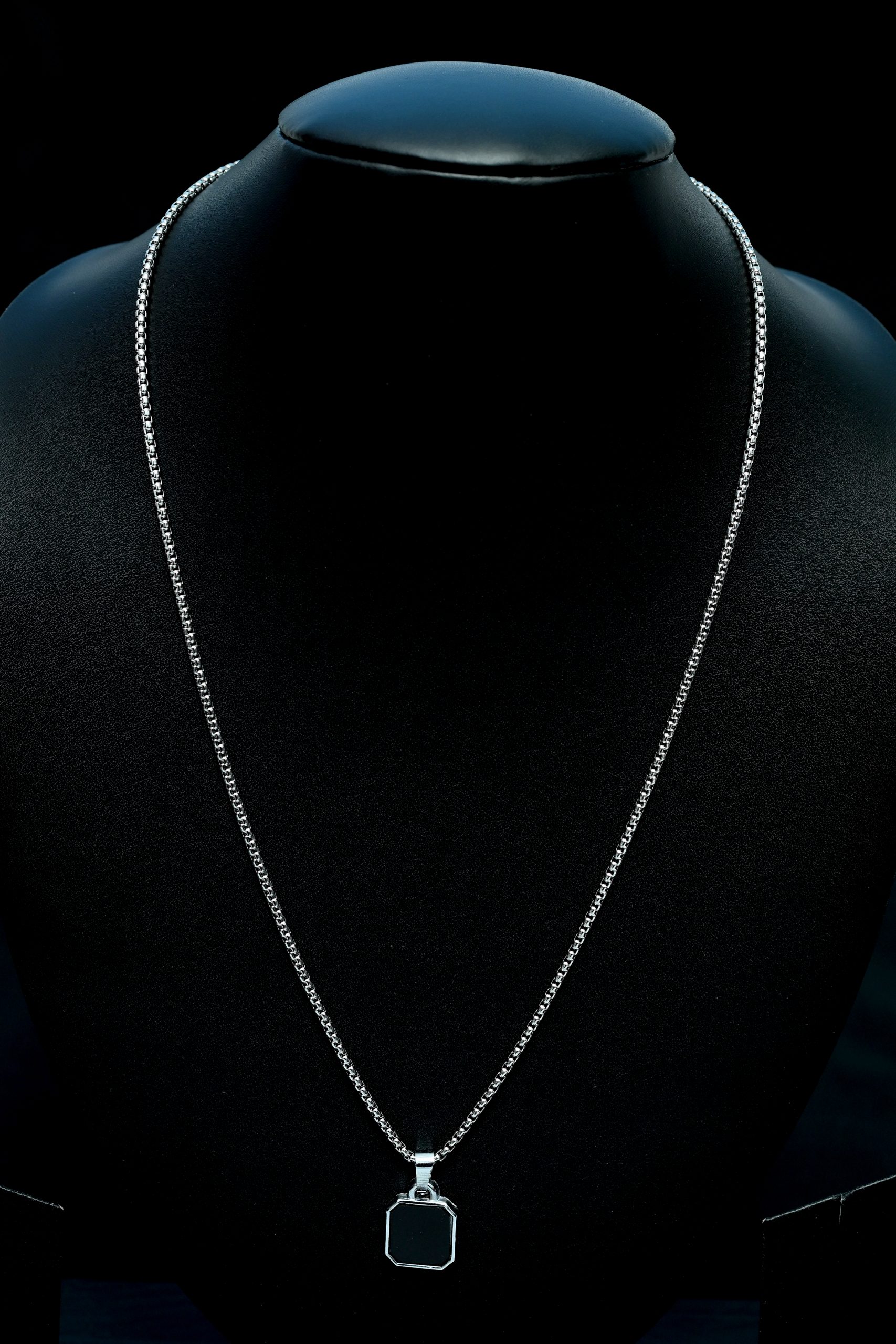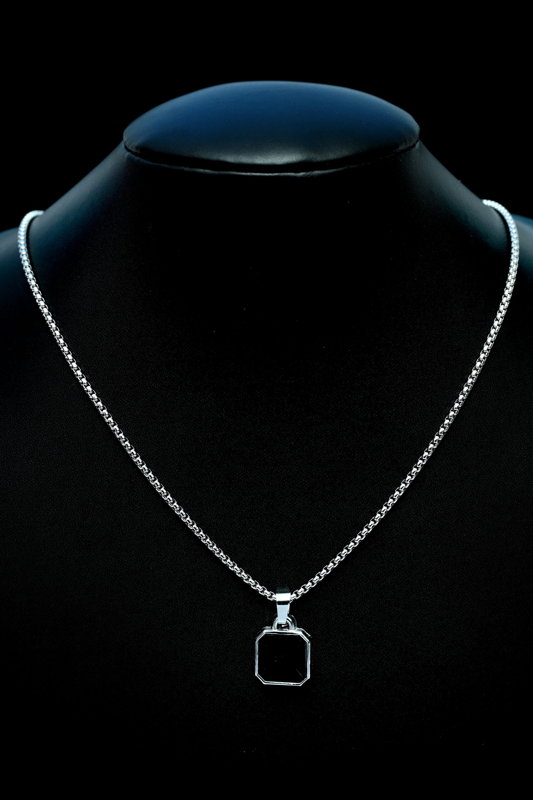 Crafted from high-quality stainless steel, the pendant features black-edged detailing that adds an instant edge to any outfit. The solid, geometric dog tag design represents confidence and individuality, while the sleek silver chain ensures a durable, comfortable fit for daily wear.