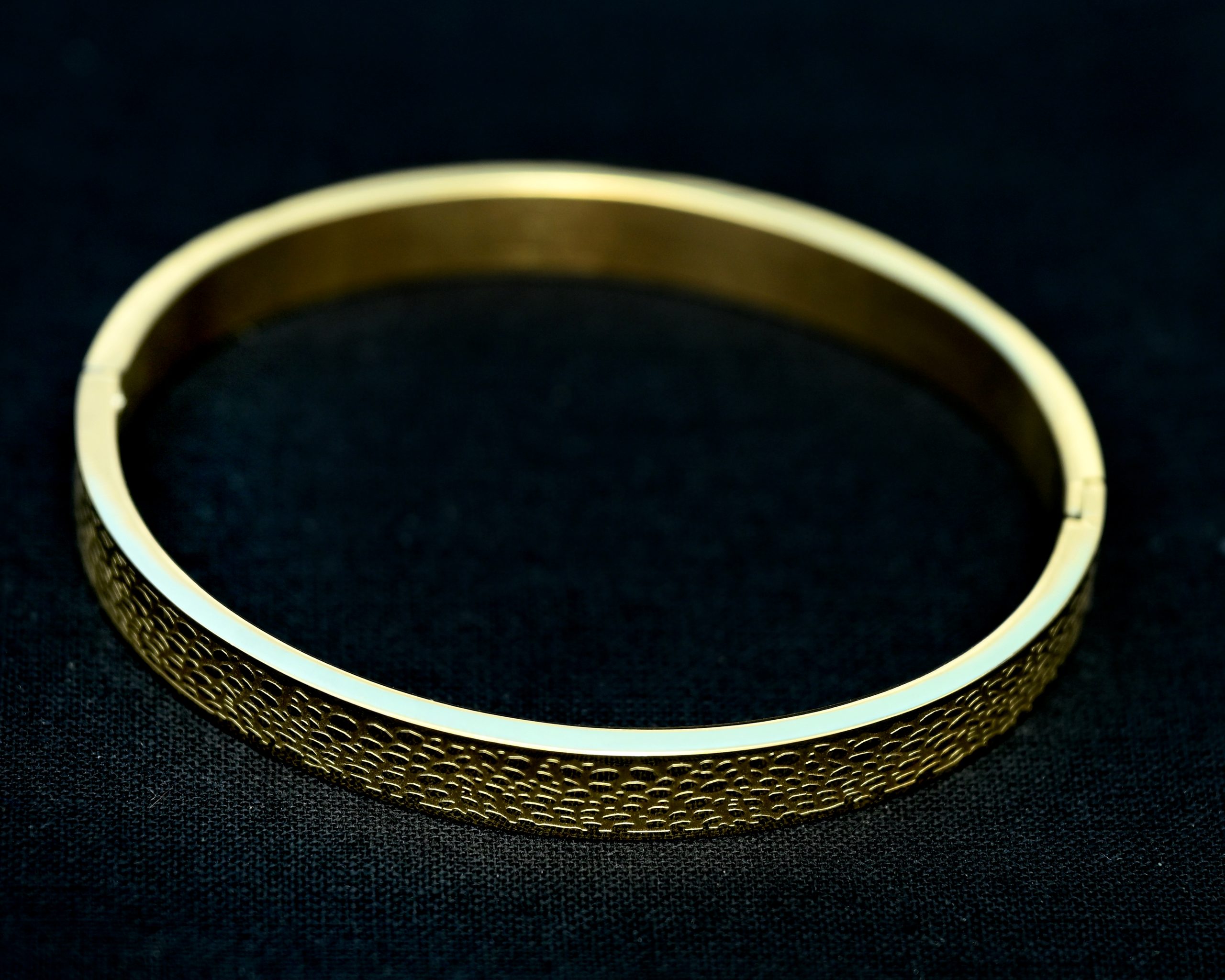 This kada features a gold-tone stainless steel finish with an elegant wave-textured pattern, symbolizing motion, energy, and continuity. The intricate texture catches light beautifully, creating a sleek metallic shine that elevates any look — from business wear to casual evenings.