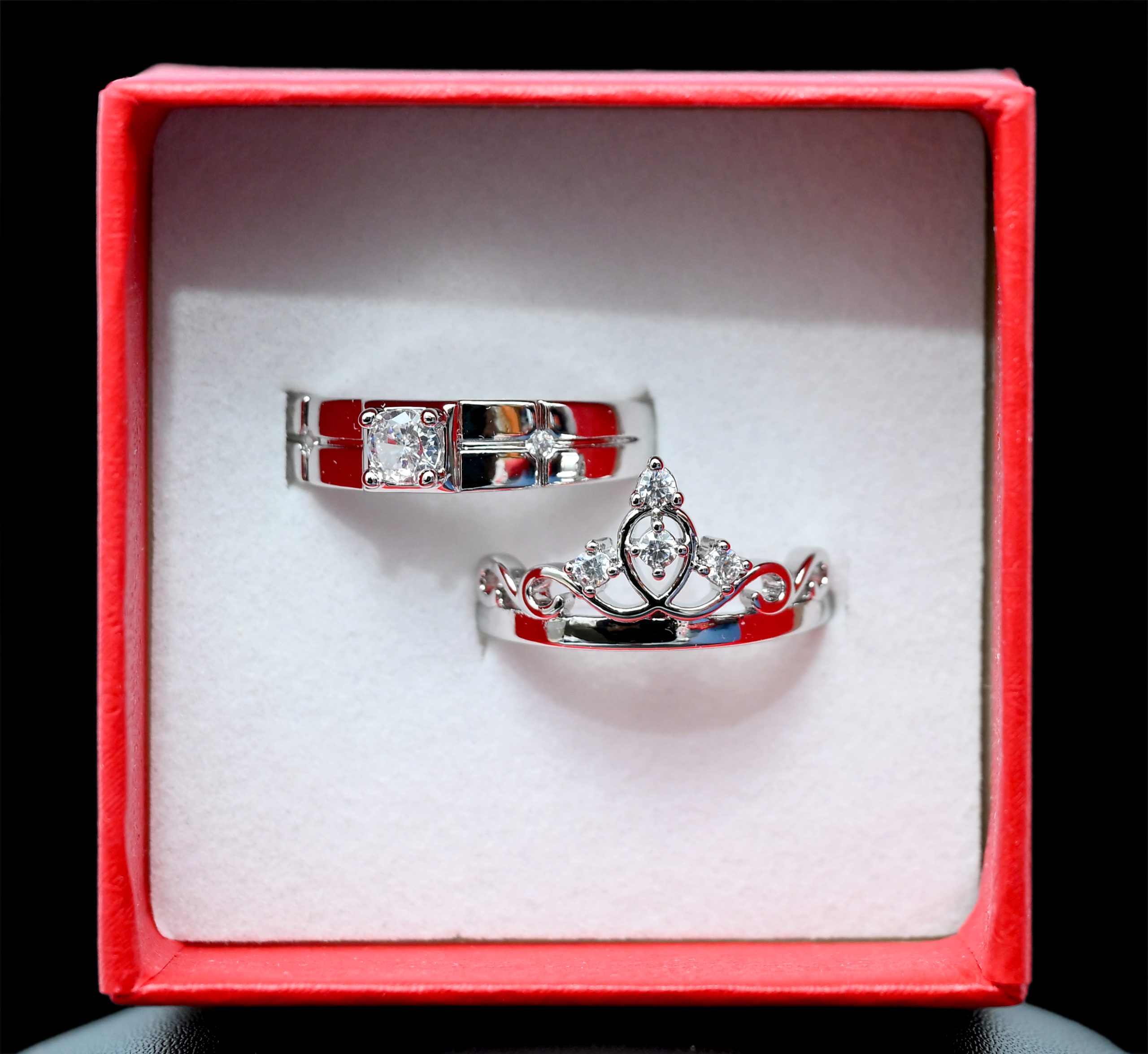 Crafted with premium silver finish, both rings exude timeless sophistication. The intricate crown detailing sparkles beautifully under any light, while the men’s ring carries a sleek, confident design that complements hers perfectly.