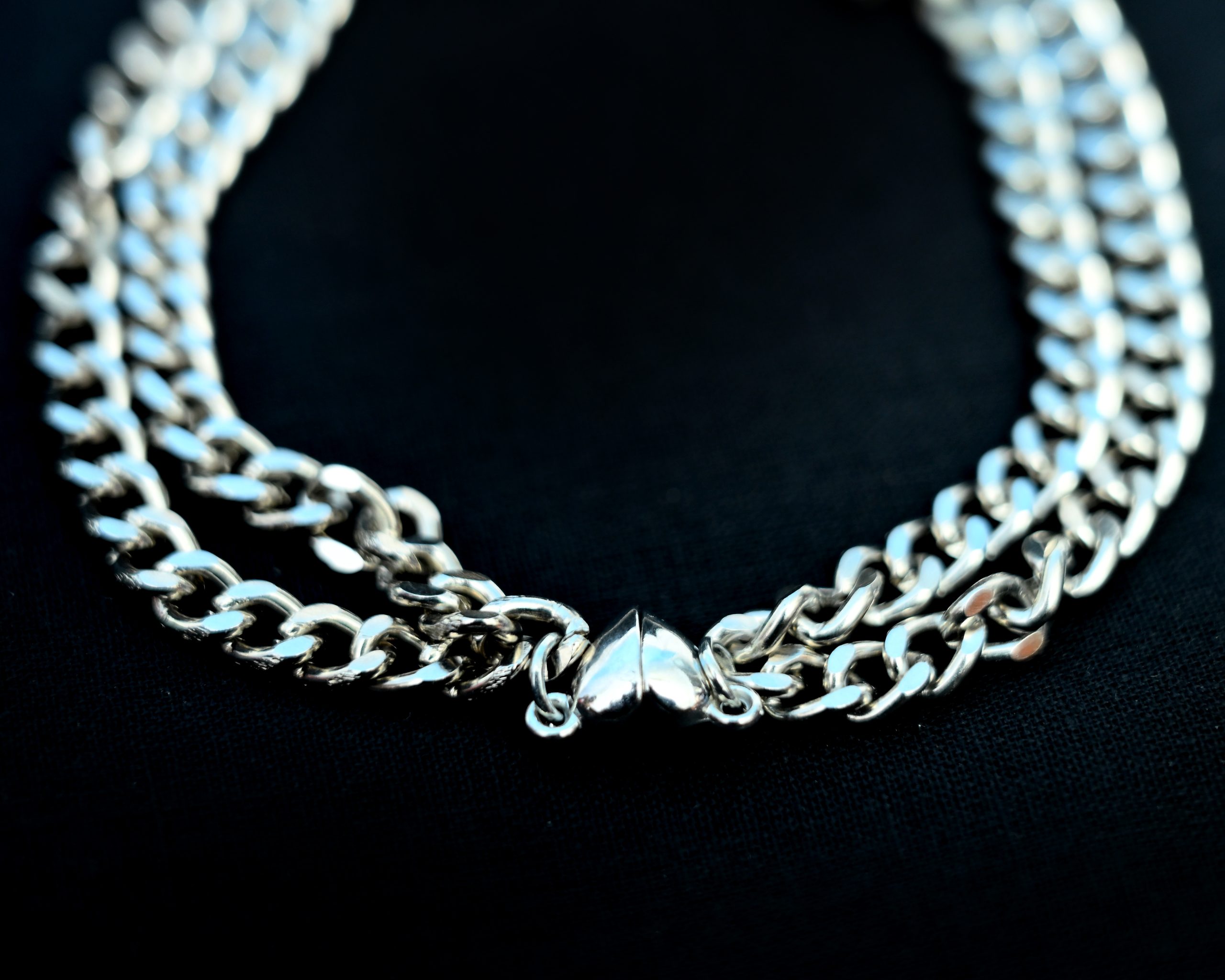 The Loha Couple Bracelet by Pettagam is crafted for couples who believe in strength and togetherness. Designed with a sturdy silver-toned curb chain, this bracelet set features a sleek half-heart charm that completes when paired — symbolizing two halves of one love.